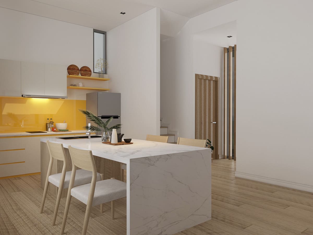 Bàn đảo bếp vừa là nơi chuẩn bị món ăn, vừa là điểm tụ họp gia đình. Tông màu trắng – gỗ – ánh sáng vàng mang lại cảm giác hiện đại nhưng vẫn ấm cúng, gần gũi.